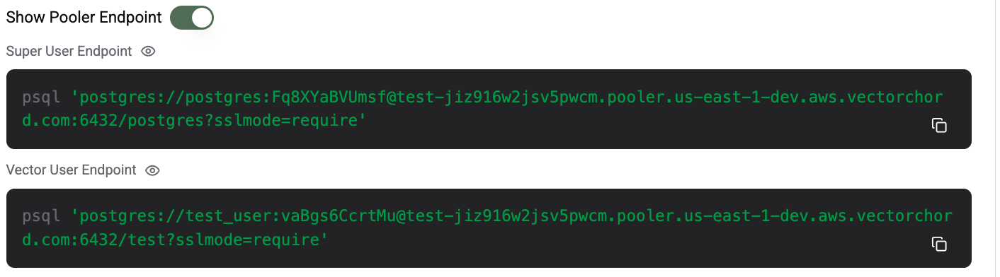 We provide two types of connection endpoints, Super User Endpoint and Vector User Endpoint respectively. For more information about the two types of connections, see Connecting with psql.